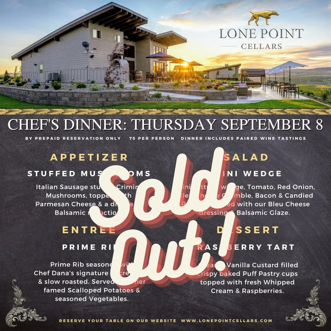 Chef Dana's famed Prime Rib Dinner! A four course feast, including appetizer, salad, entree, and dessert. Each course is paired perfectly with one of our delicious wines. Dinner starts promptly at 6:00 pm and finishes around 8:00 pm. The full menu will be available online the Sunday before dinner. Come enjoy a wonderful evening with us!